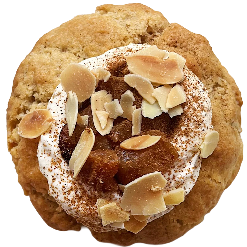 C’est la saison des poires, et on sait que beaucoup d’entre vous raffolent de la crème sur nos cookies. On a donc imaginé un cookie façon tarte aux poires caramélisées aux épices chai, avec une généreuse crème diplomate décorée d’amandes effilées grillées.